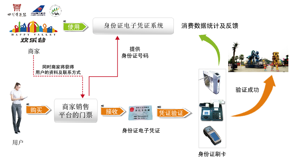 此方案适合所有愿意将传统票务系统升级为身份证电子凭证、电子票务系统的商家和代理商,我们为此合作者提供了从网络电商平台搭建、软硬件集成开发、开放接口、维护等全系统的方案,我们建立的电商平台直接接入各种网银平台,用户在线支付完成后,凭二代身份证即可到此电商平台的对应实体商家消费,无需排队、无需等待、无需繁琐验证,让用户立即获得一系列完善的消费体验。