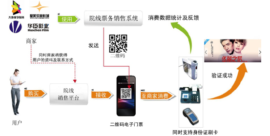 以大连良人科技有限公司电子凭证为基础的电子票务,是一种电子化的票务应用模式,用电子票替代传统的纸质实体票,从而实现网络销售。消费者可在网络上选择自己所需要的院线电子票券种类和数量并生成订单,在支付完成后,系统将会向消费者提供的手机号内发送含有票券信息的二维码彩/短信。消费者只需凭借收到的二维码信息到指定的院线通过验证后,即可获得票券相应的产品或服务。